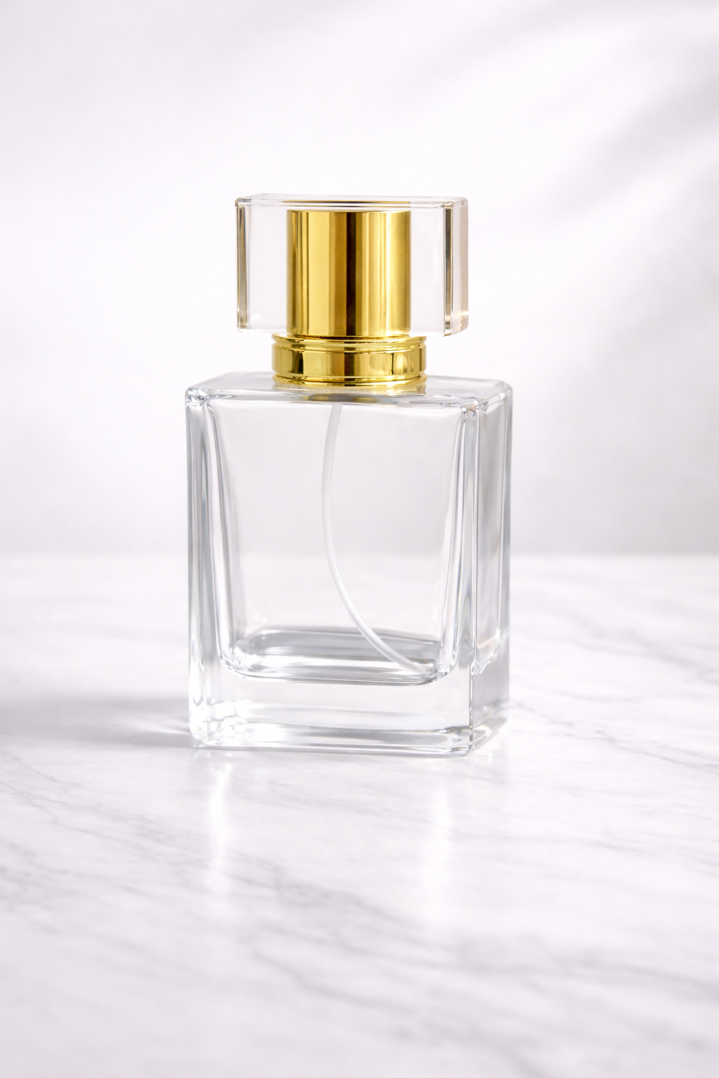 This perfume bottle features a bold and luxurious square design crafted from thick, crystal-clear glass. The sharp edges and structured silhouette give it a strong, modern presence, while the heavy base adds a premium, high-end feel.