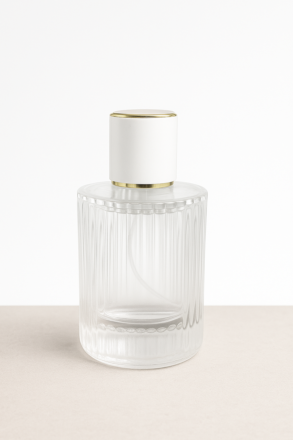 Crafted from thick, high-quality clear glass, this cylindrical perfume bottle features refined vertical ribbed detailing that adds texture, depth, and sophistication. The structured lines catch the light beautifully, giving it a premium, high-end appearance perfect for niche, luxury, or signature fragrance collections.